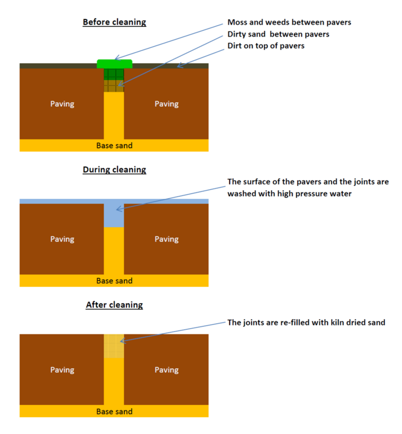 The diagram below shows the basic process involved in the cleaning of a block paved driveway: